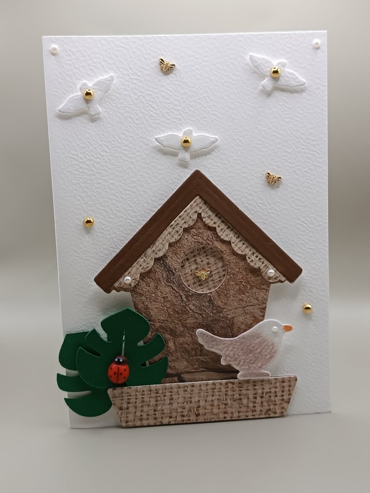 Cabane, oiseau et coccinelle en relief pour un effet élégant et raffiné.